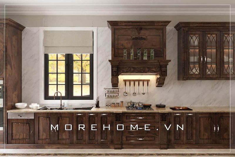 Thiết kế nội thất gỗ tự nhiên cho phòng bếp biệt thự tân cổ điển đẹp, sang trọng và đẳng cấp
